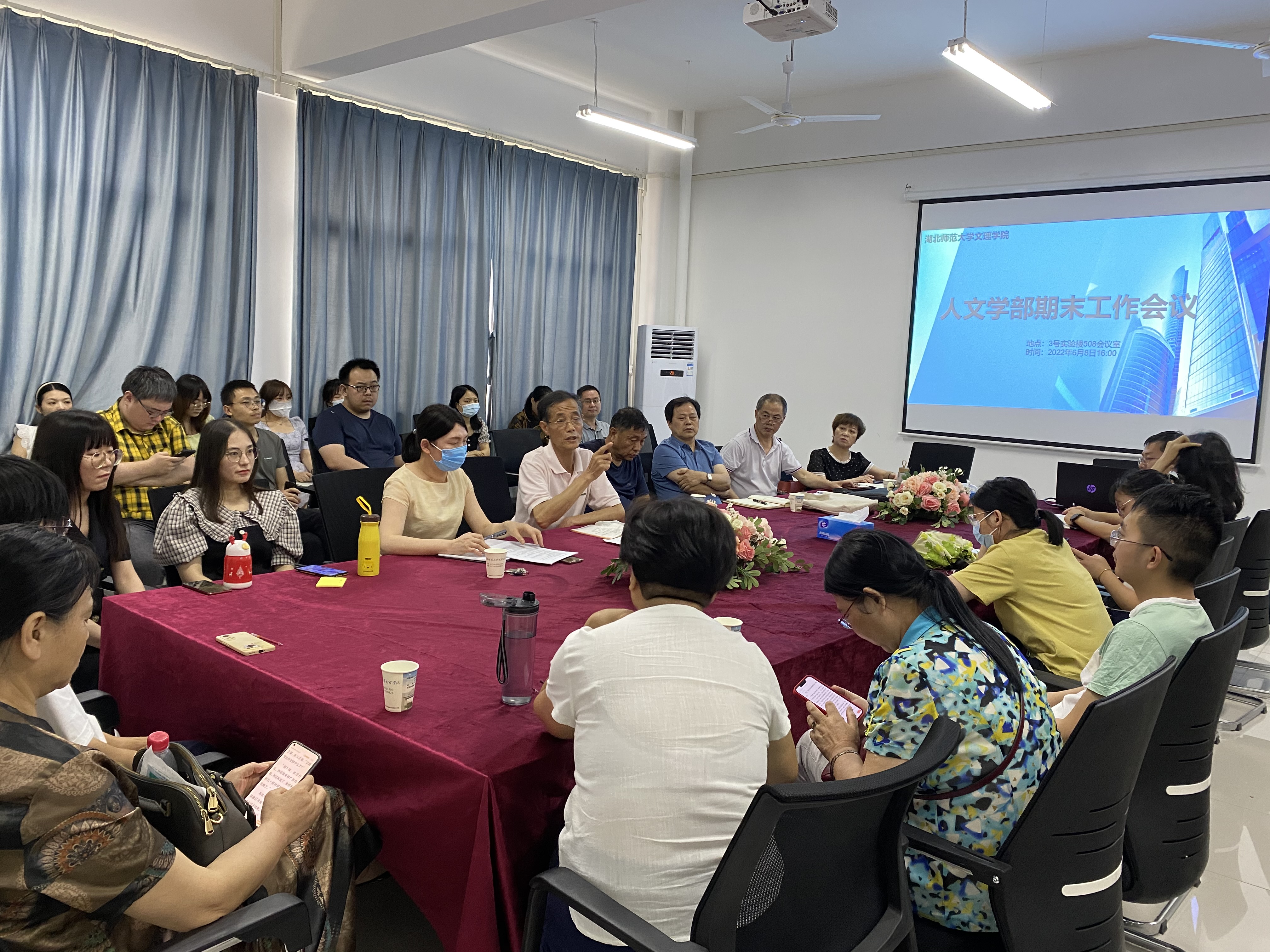 2022年6月8日下午四点,人文学部在3号实验楼508会议室召开了全体教职工期末工作会议,参加此次会议的有人文学部主任熊子延、学部副书记汪玉宝以及人文学部全体教职工。