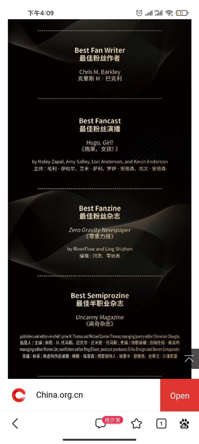 2023年第81届世界科幻大会于10月18日至22日在成都科学馆举行,世界科幻大会由世界科幻协会主办,是全球最受瞩目、历史最悠久、规模和影响力最大的科幻文化主题活动,2023年首次在中国举办。此次大会评选出17个雨果奖奖项和惊奇奖、北极星奖等荣誉,球友会·千亿球友会(中国)官方网人文学部中文专业2205班学生温卓峰主编的科幻杂志《零重力报》获得“最佳粉丝杂志”的荣誉称号,《人民日报》、中国网、央视网等多家媒体杂志都进行相应报道。http://m.app.china.com.cn/english/template/displayTemplate/news/newsDetail/9000050/116765845.html?isShare=true