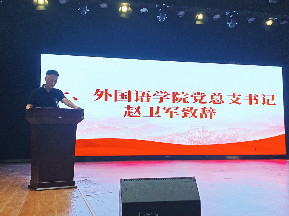 伴随着一段精彩的迎新剪影,外国语学院2025级新生见面会拉开帷幕。外国语学院党总支书记赵卫军首先为新生带来思想引领与成长寄语,赵书记对新生们提出四点期望:一要坚定理想信念,培养道德情操;二要勤奋刻苦学习,练就刻苦本领;三要积极投身实践,锤炼品德修为;四要勇于担当,书写青春华章。他勉励同学们牢记初心使命,在青春的赛道上跑出当代青年的最好成绩。